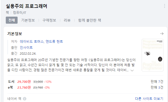 - 개발에 처음 입문한 사람도, 개발을 오래 한 사람도 읽으면 좋을 것 같습니다. 어떤 언어를 쓰든, 프론트든 백이든, 공통적으로 적용할 수 있는 이야기가 많더라구요.